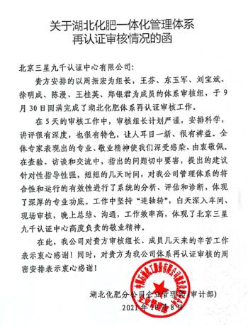 10月8日,公司收到湖北化肥分公司發(fā)來(lái)感謝信,對(duì)三星九千審核組表現(xiàn)出的專(zhuān)業(yè)、敬業(yè)精神表示衷心感謝。客戶(hù)的認(rèn)可是三星九千前進(jìn)的動(dòng)力。今后三星九千將會(huì)一如既往,為湖北化肥做好QESEn管理體系建設(shè)的服務(wù)工作,為湖北化肥對(duì)標(biāo)一流化工企業(yè)管理提升貢獻(xiàn)力量。