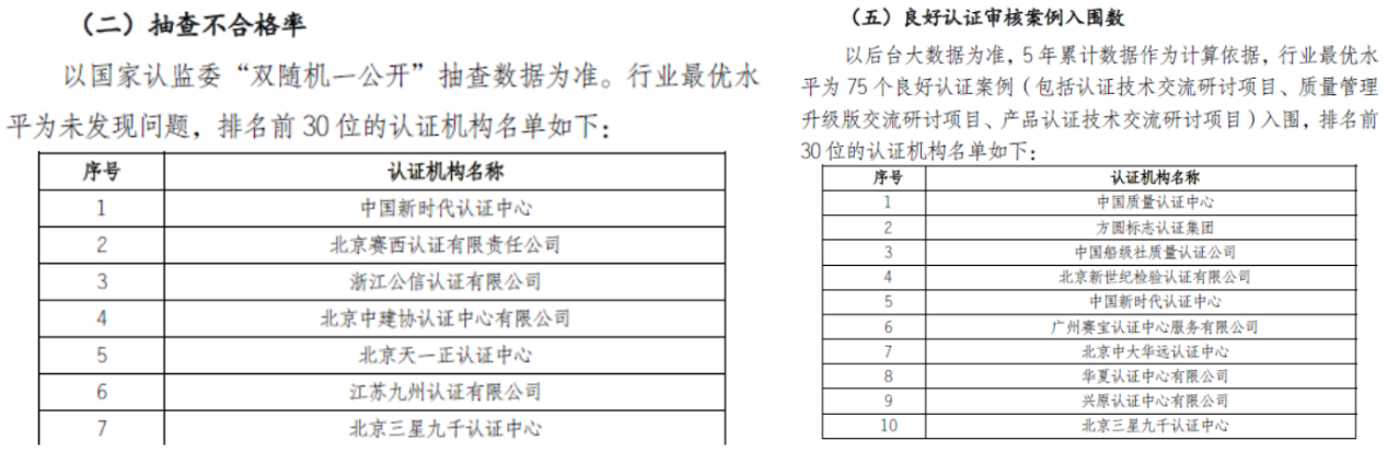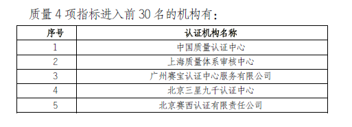 六類評(píng)價(jià)中,質(zhì)量指標(biāo)是核心,北京三星九千認(rèn)證中心(以下簡(jiǎn)稱三星九千)在衡量認(rèn)證機(jī)構(gòu)認(rèn)證質(zhì)量5項(xiàng)指標(biāo)中,有4項(xiàng)指標(biāo)——抽查不合格率(行業(yè)最優(yōu)水平為未發(fā)現(xiàn)問(wèn)題)、注冊(cè)認(rèn)證人員充分率、良好認(rèn)證審核案例入圍數(shù)、投訴率(行業(yè)最優(yōu)水平為零投訴)排名前列。其它類指標(biāo)中,還在主持/參與編制的國(guó)標(biāo)行標(biāo)數(shù)、參與政府部門(mén)和認(rèn)證行業(yè)及相關(guān)管理部門(mén)的項(xiàng)目數(shù)、核心期刊發(fā)表論文數(shù)、誠(chéng)信信息等創(chuàng)新、信譽(yù)、品牌類指標(biāo)排名領(lǐng)先。